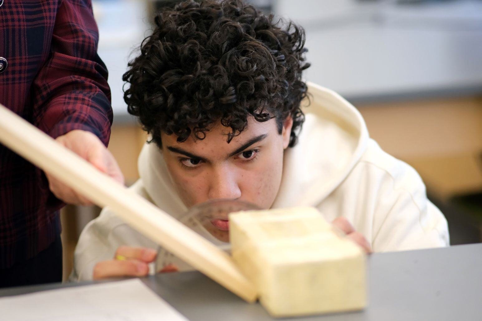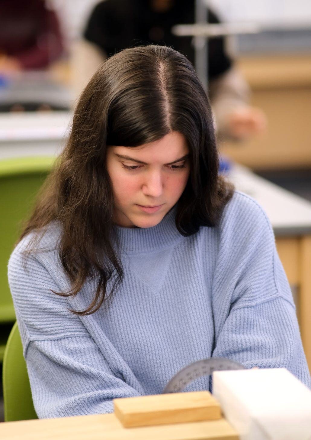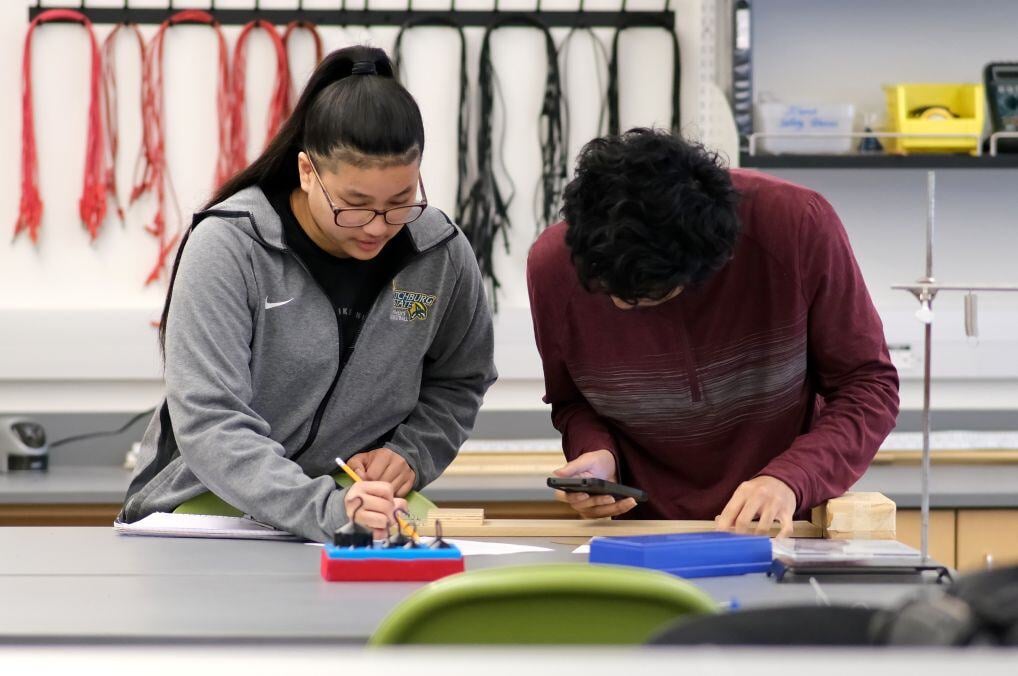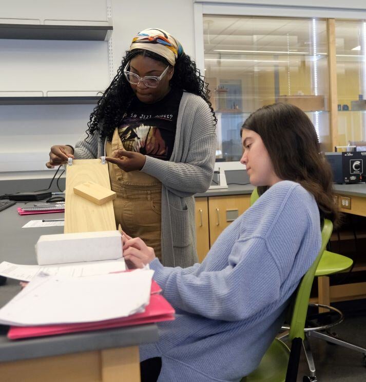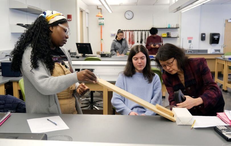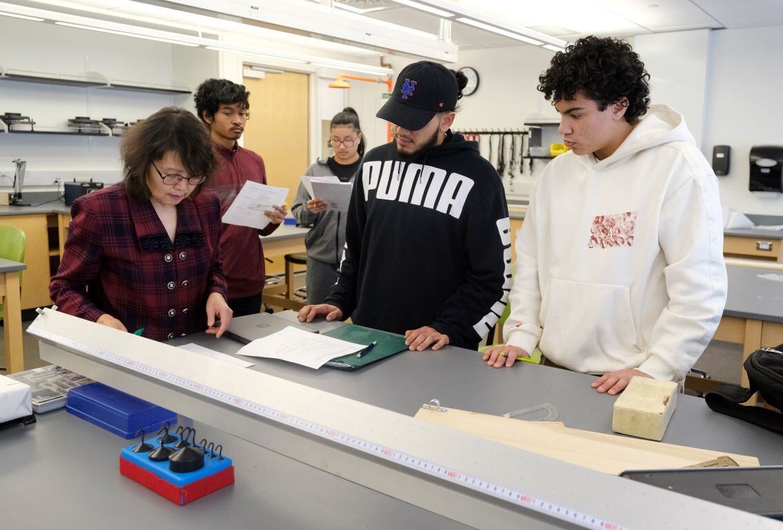 Environmental, Geographic and Public Health Sciences Professor Jiang Yu helps students with an experiment in her General Physics I course. This first-semester general college physics course consists of studies in the principle and application of classical mechanics, waves, sound and heat. Typical topics include description of motions, Newton's laws of motion, Kepler's law of planetary motion, universal gravitation, work and energy, conservation laws, temperature, heat, and laws of thermodynamics.