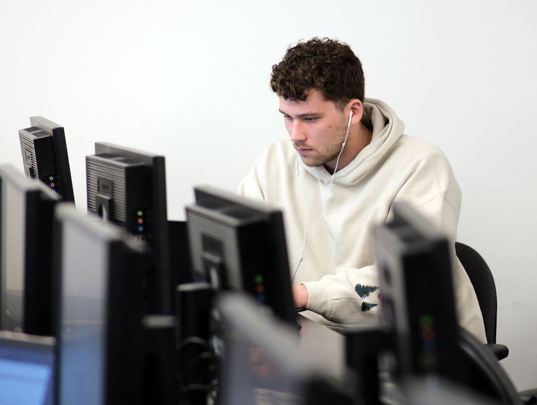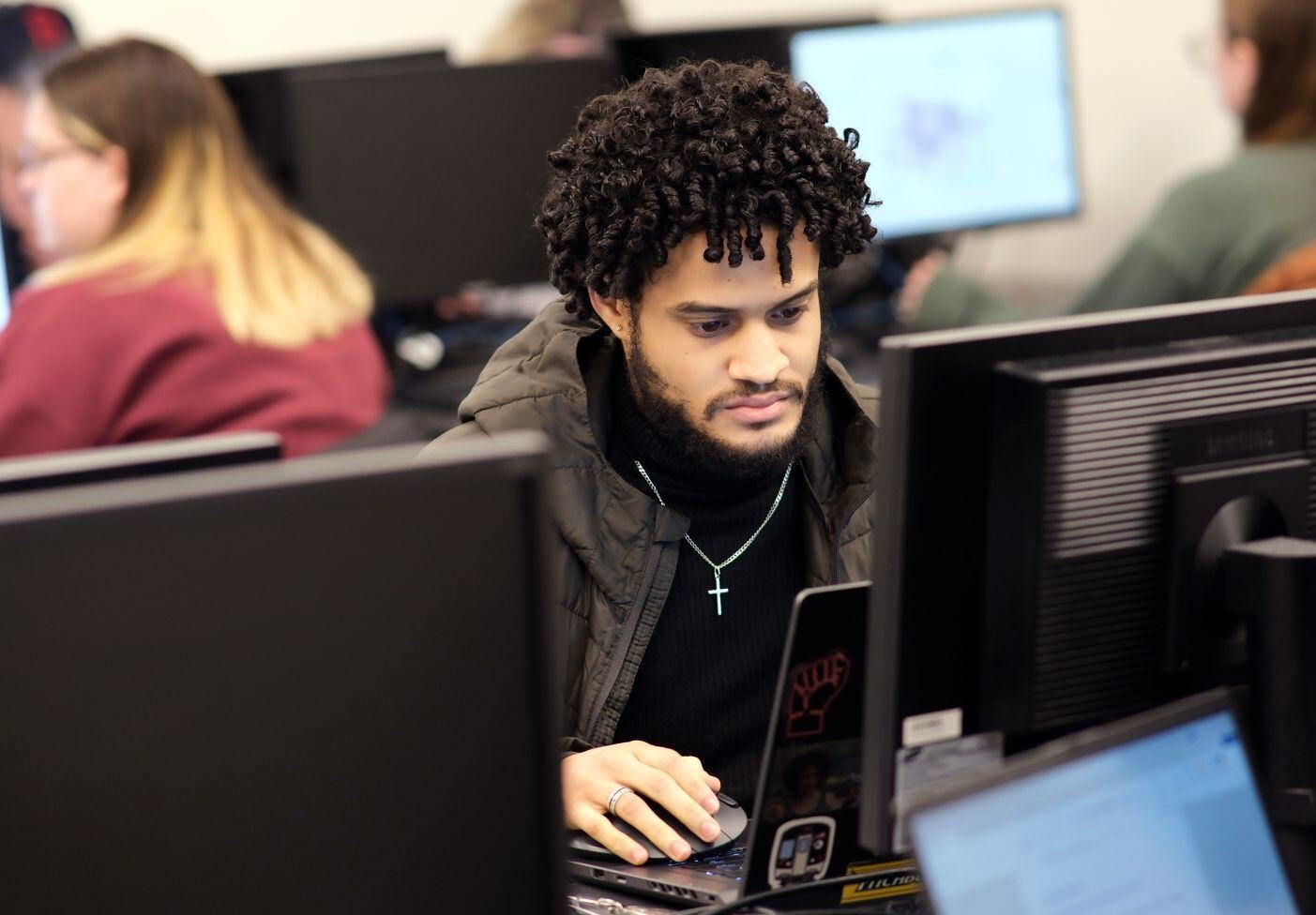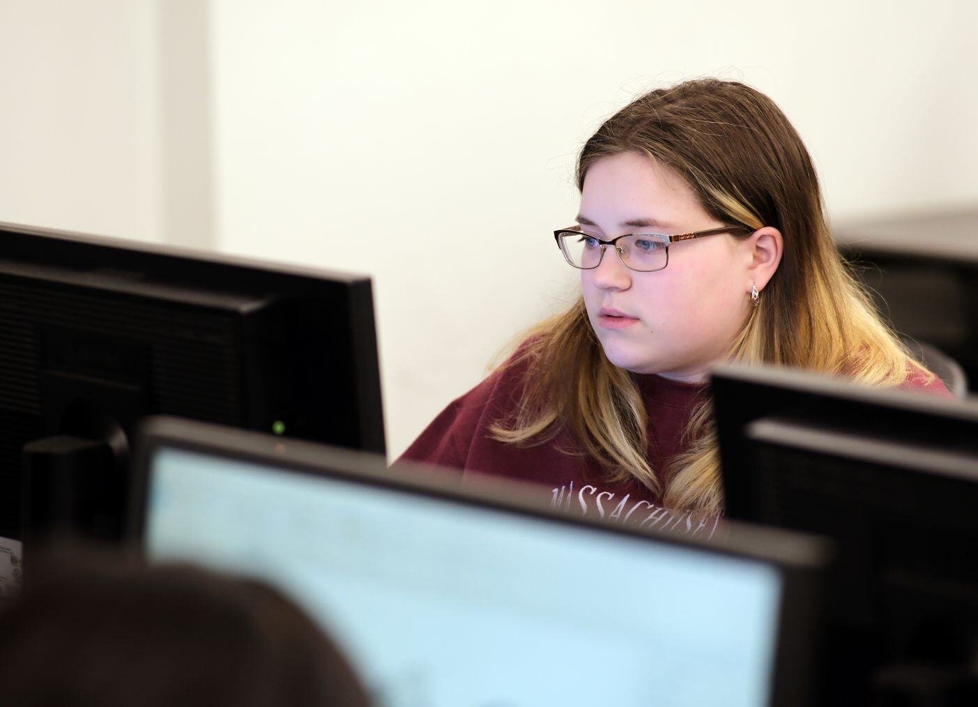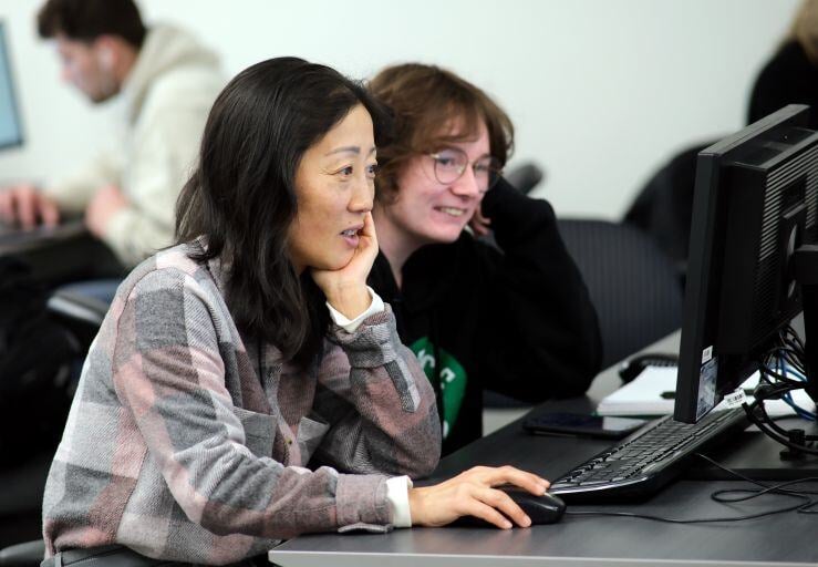 Students in Earth and Geographic Sciences Professor Jane Huang's GIS (Geographic Information System) for Criminal Justice course work on an advanced mapping project in the Antonucci Science Complex. The course introduces students to the theory and application of crime mapping and analysis in a GIS (Geographic Information System) environment. Students will learn the criminological theories that supports crime analysis and place-based policing. Students will also learn the basic skills of using GIS to create crime maps and to analyze crime patterns.