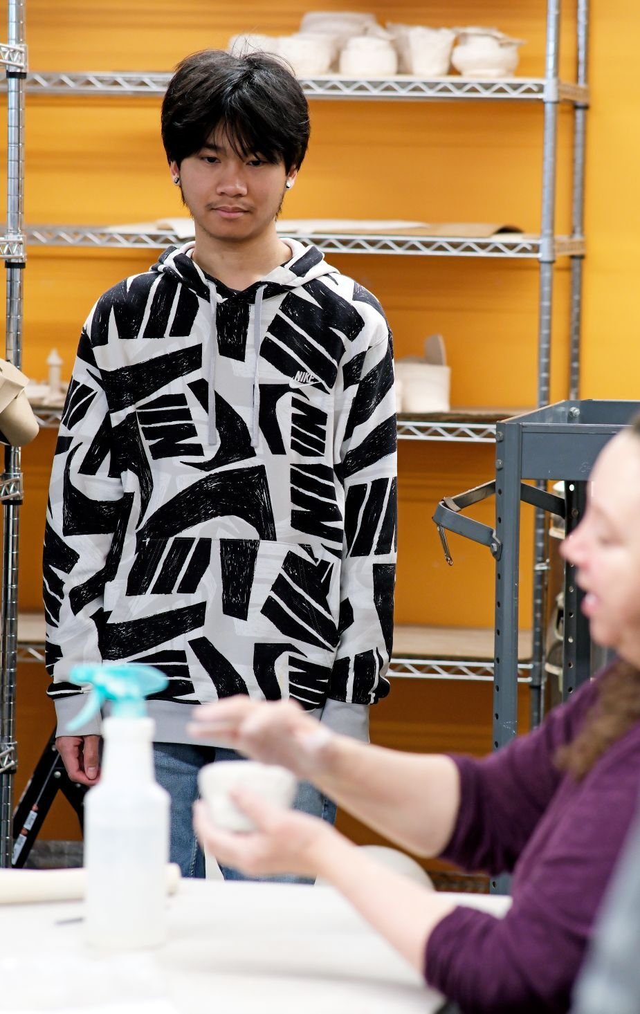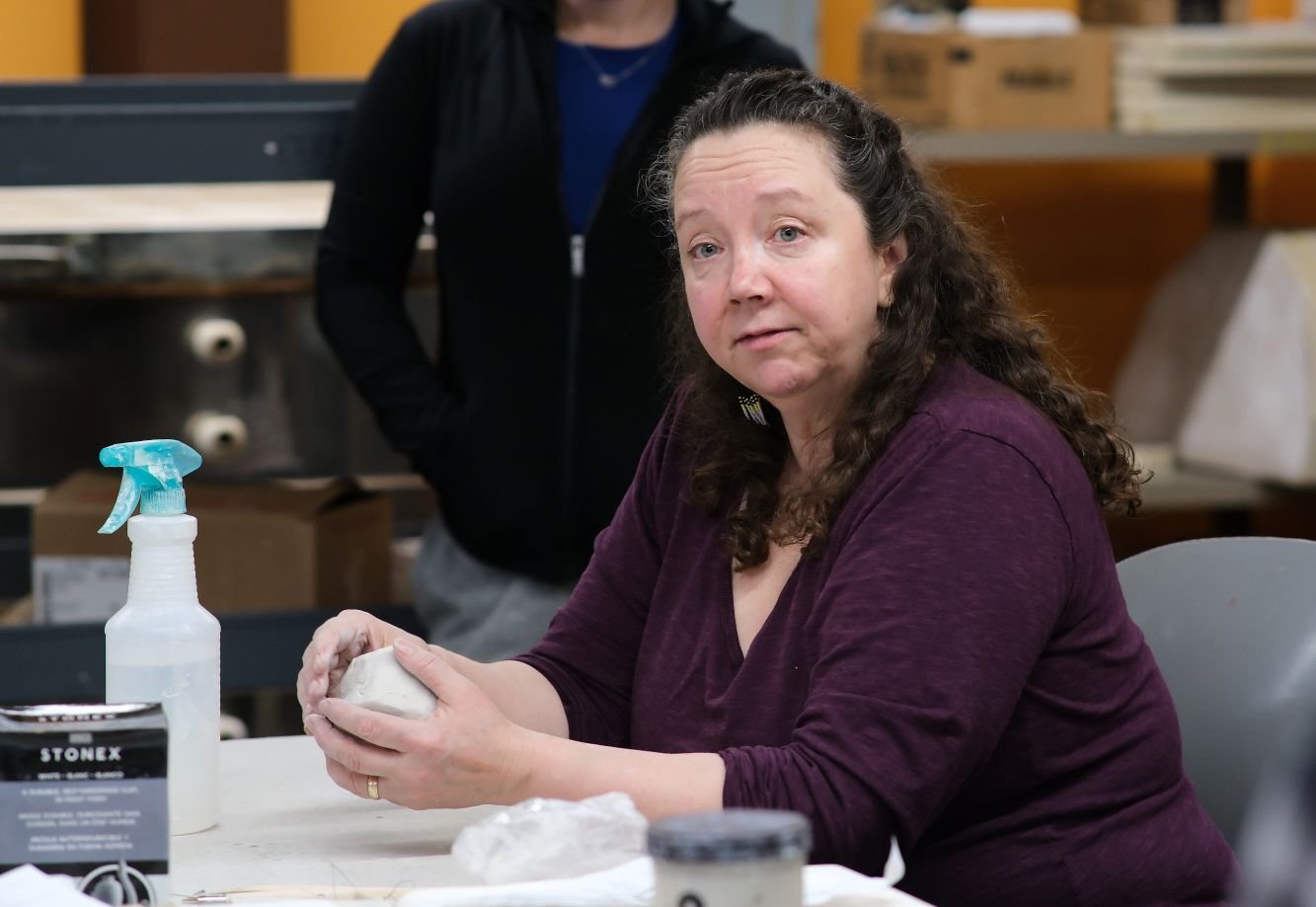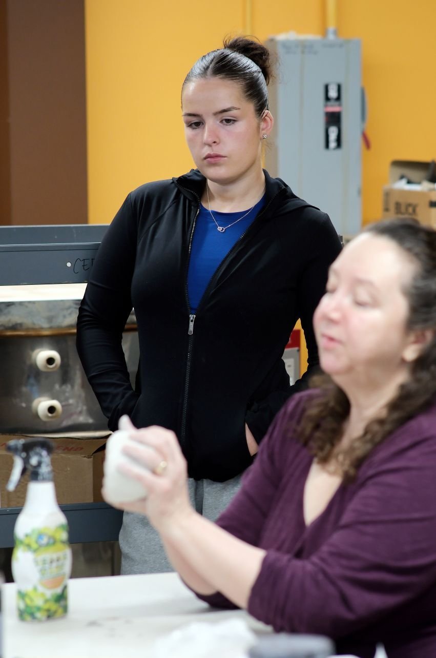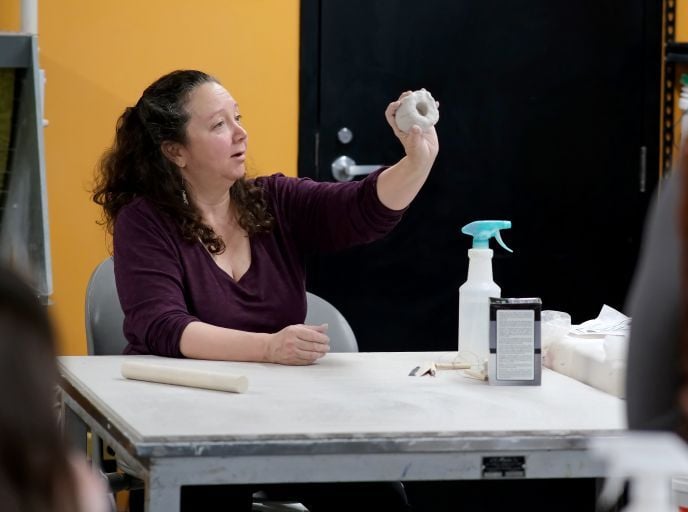 Students in Intro to Studio Art class learned about making a pinch pot in the Conlon Fine Arts building. This course provides a hands-on introduction to drawing, painting, and sculpture. The course emphasizes the fundamentals of each studio discipline, and will also explore the expressive potential of visual art: how the various elements of drawing, painting, and sculpture can be used to embody very different feelings and ideas. Learn more about our Fine Art Program here.