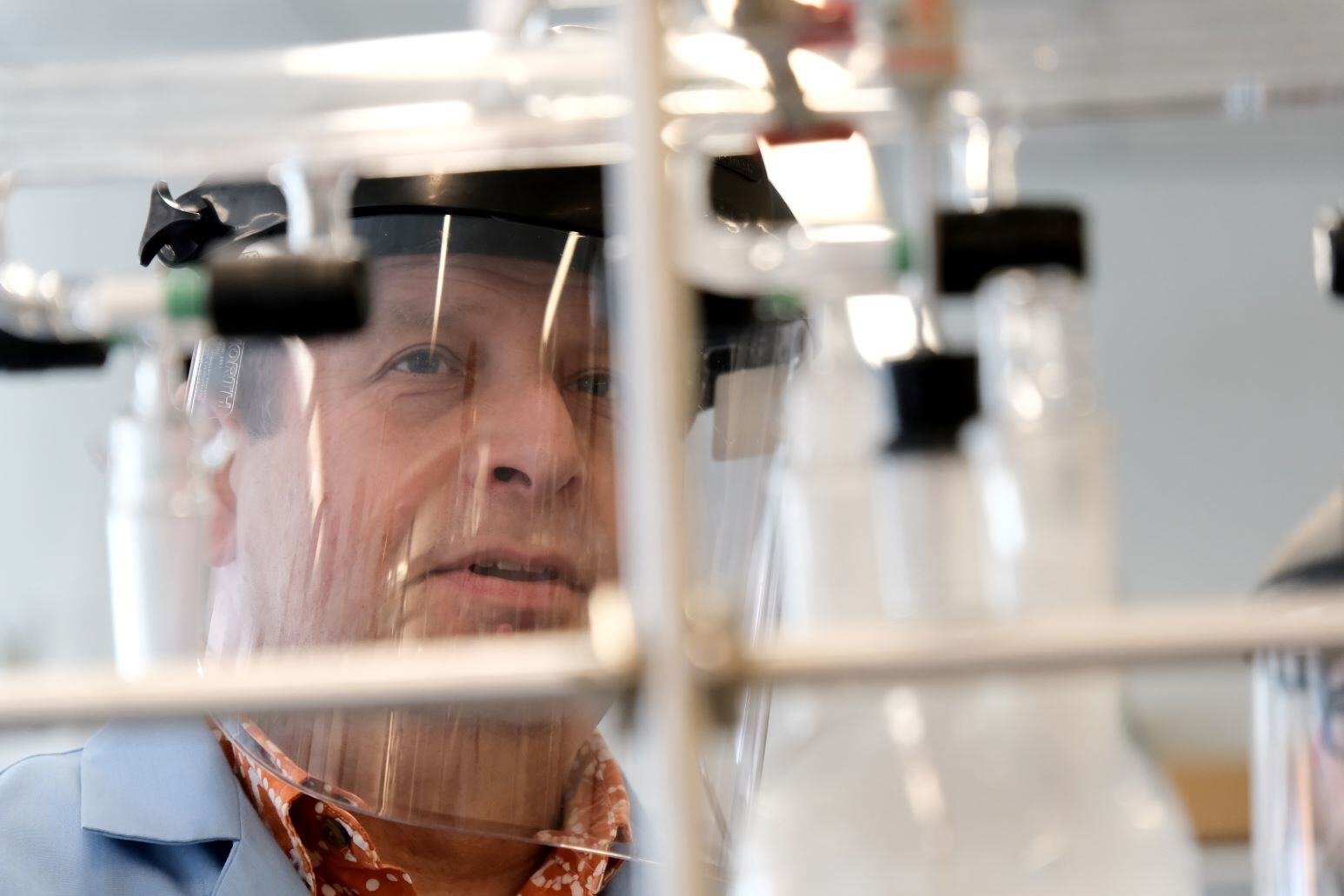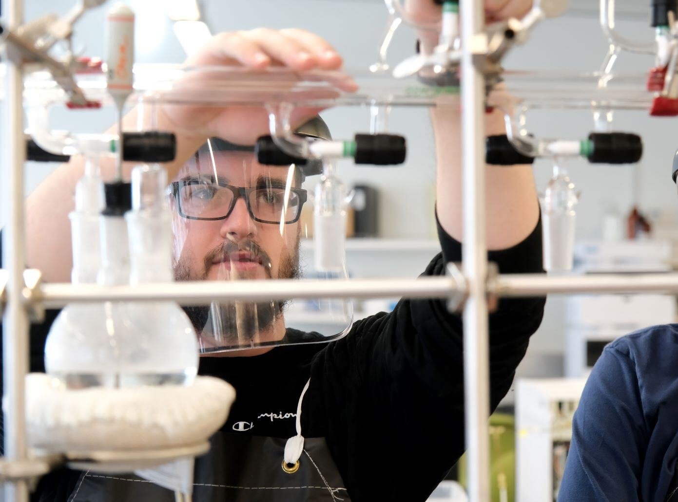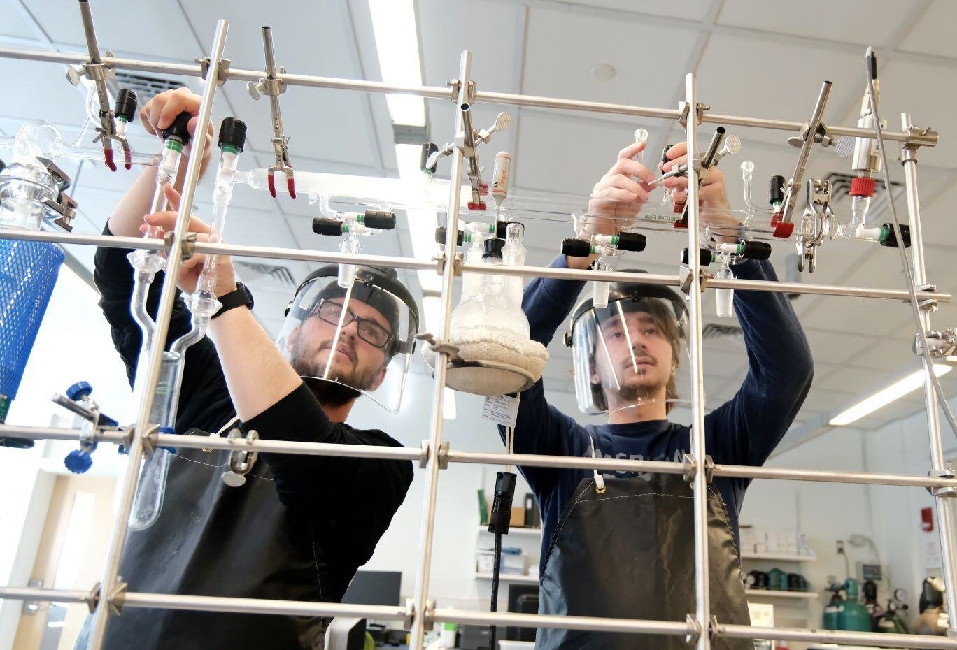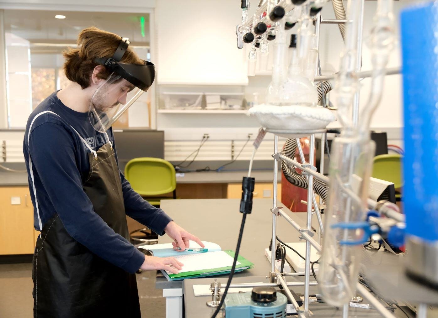 Students in Biology and Chemistry Professor Steven Fiedler's Physical Chemistry 1 Lab work on an experiment where they bring water to a boil at room temperature utilizing pressure in the Antonucci Science Complex. The course explores the underlying principles of chemistry from a physical chemistry standpoint. Topics of discussion include kinetic theory, theories of the structure of matter, theory of solutions, electrochemistry, thermodynamics, spectroscopy and kinetics.