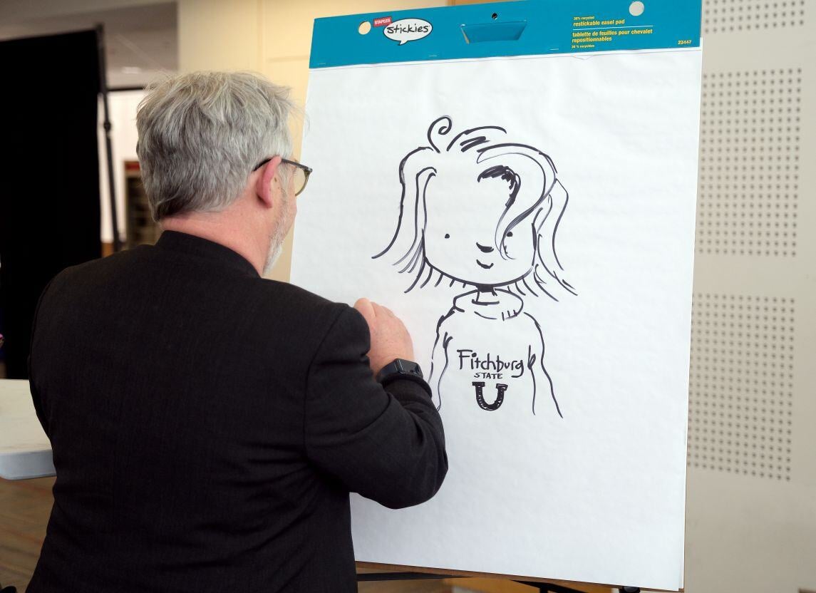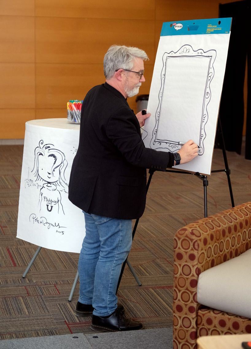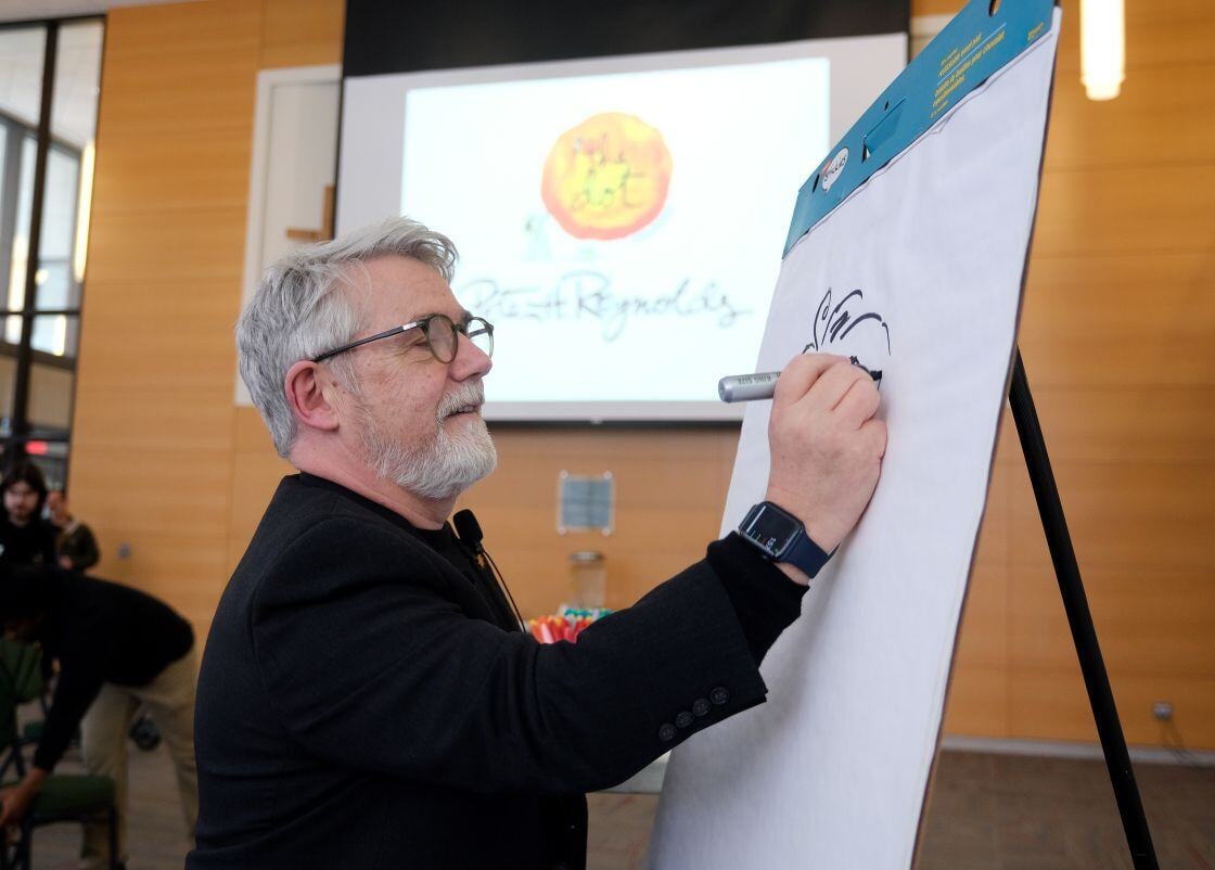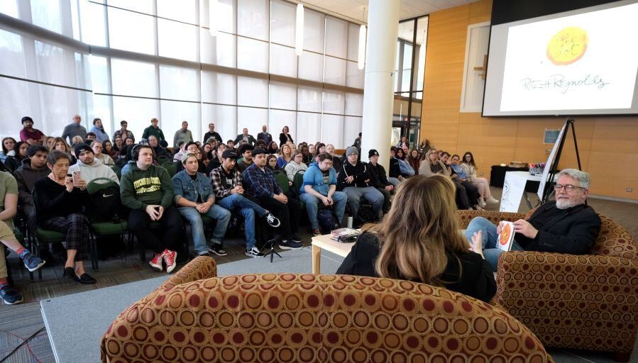 Best-selling author and illustrator Peter H. Reynolds, a 1983 alumnus of Fitchburg State University, returned to the campus earlier this month for an artist residency for a series of events with students, faculty and community members. On this day, Mr. Reynolds sat with President Hodge for a Q&A session in front of a crowded audience of students, faculty, staff, and community members in the Hammond Hall Main Lounge. Learn more about Peter H. Reynolds' visit to campus here.