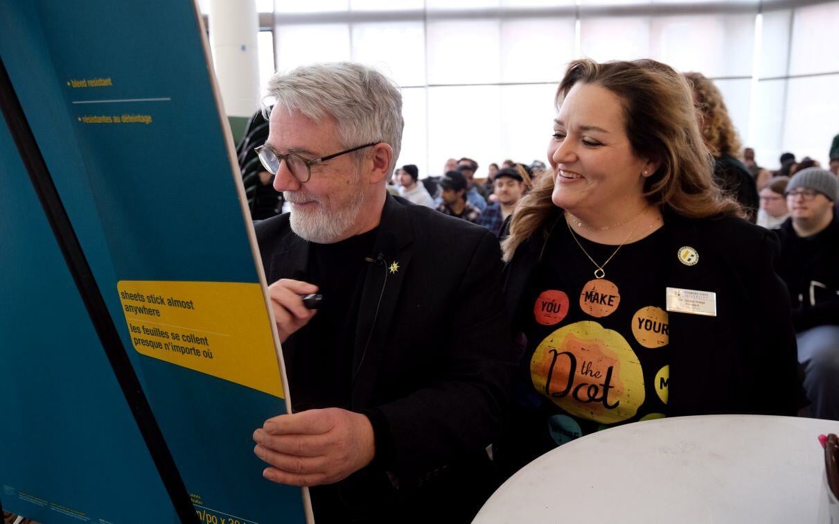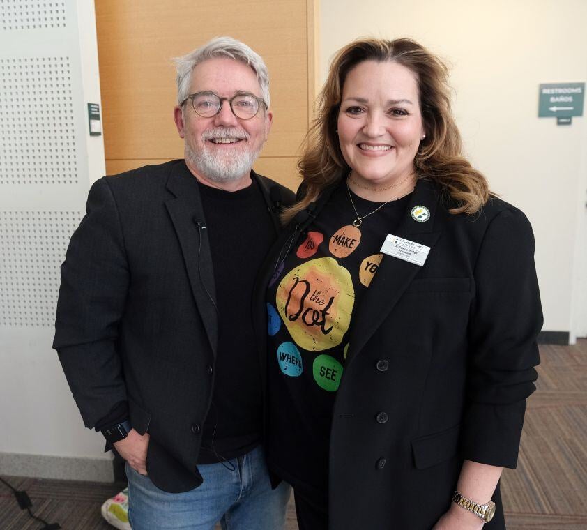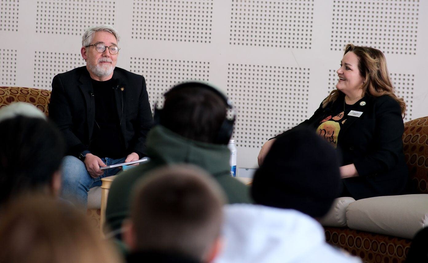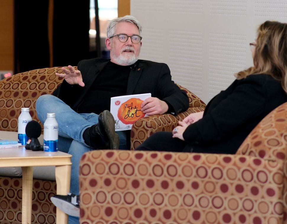 Best-selling author and illustrator Peter H. Reynolds, a 1983 alumnus of Fitchburg State University, returned to the campus earlier this month for an artist residency for a series of events with students, faculty and community members. On this day, Mr. Reynolds sat with President Hodge for a Q&A session in front of a crowded audience of students, faculty, staff, and community members in the Hammond Hall Main Lounge. Learn more about Peter H. Reynolds' visit to campus here.