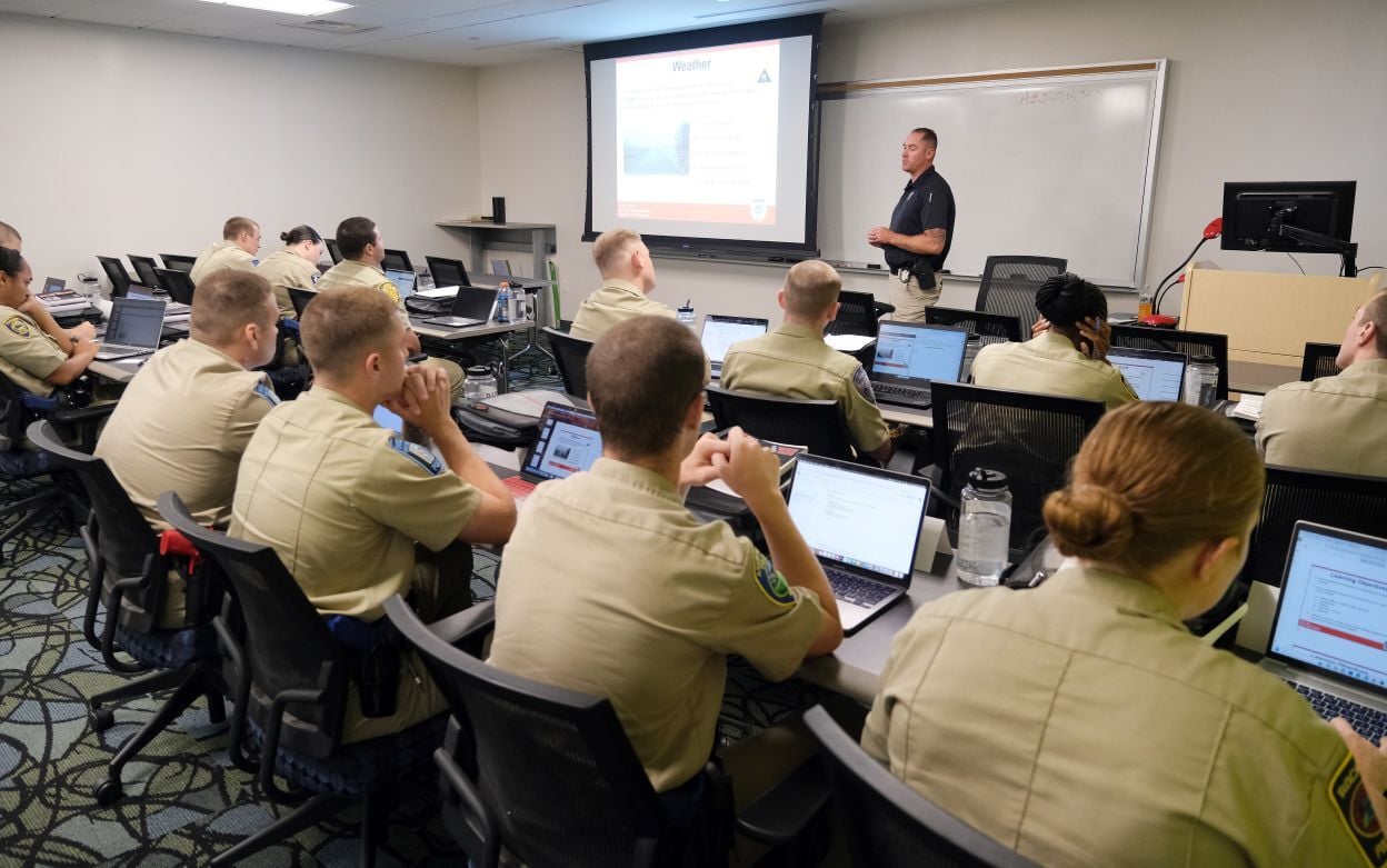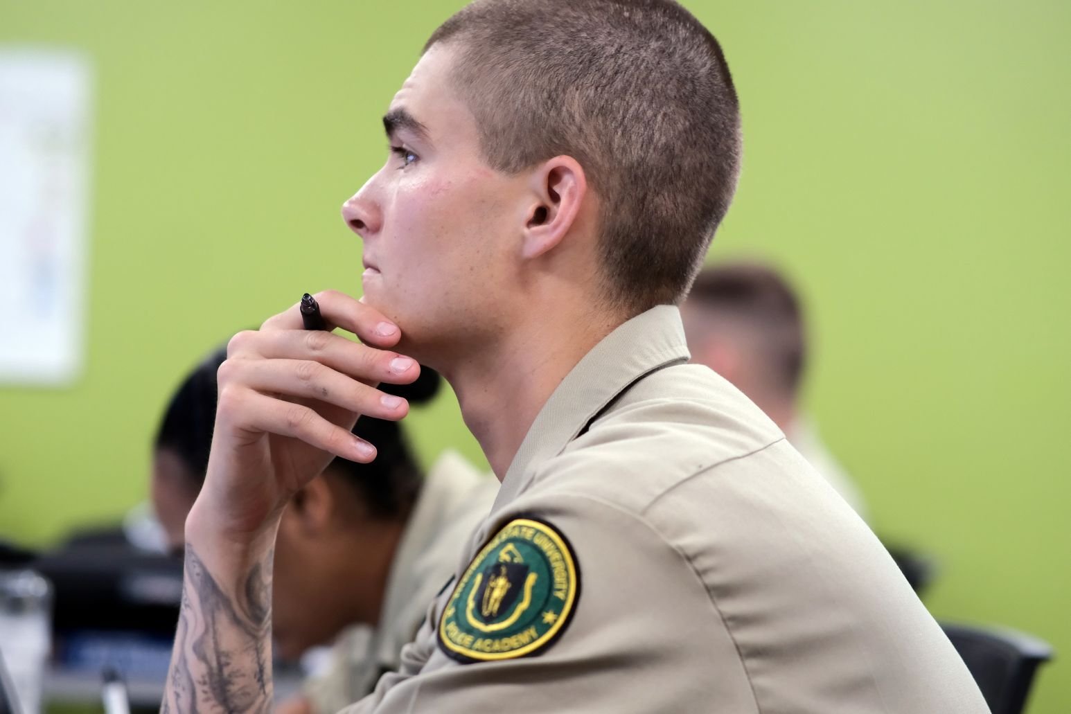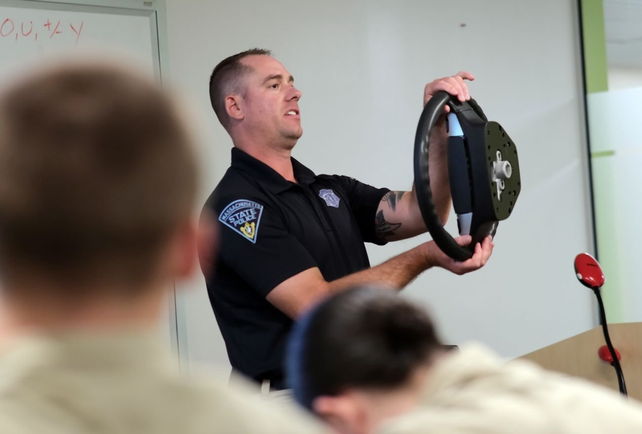 The 8th Fitchburg State University Police Program's Recruit Officer Course (ROC) took their Emergency Vehicle Operator Course (EVOC) classroom training prior to next weeks on-road training at an off-campus EVOC facility.