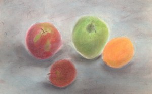 We are now working with colors and pastels. Our last assignment was drawing fruits and mixing the pastels according to the color wheel to make the colors of the fruit as realistic as possible. So far I like working with pastels because of all the cool colors you can make by mixing all the colors you already have. I think this pastel painting came out really nice considering it was my first time ever working with pastels.