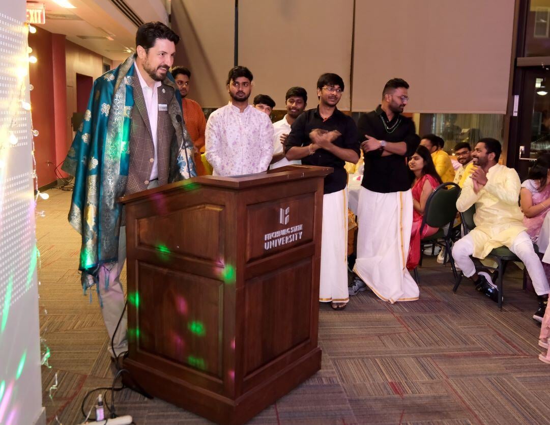 Last night, the Office of International Education (OIE) and the Fitchburg Indian Student Association observed Diwali in the Main Lounge of Hammond Hall. Diwali is the Hindu festival of lights with its variations also celebrated in other Indian religions. It symbolizes the spiritual "victory of light over darkness, good over evil,