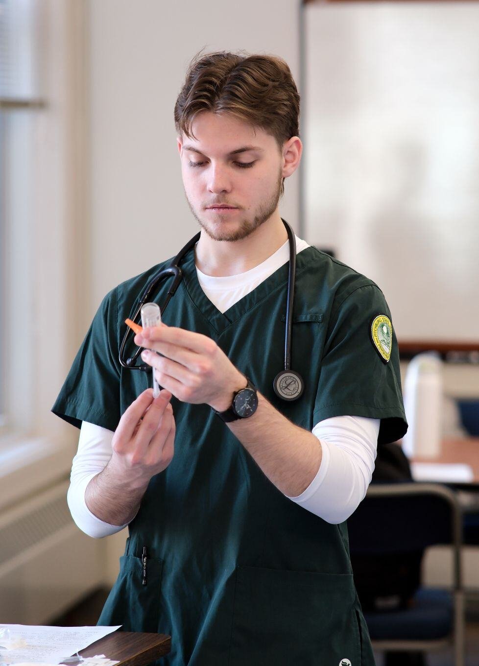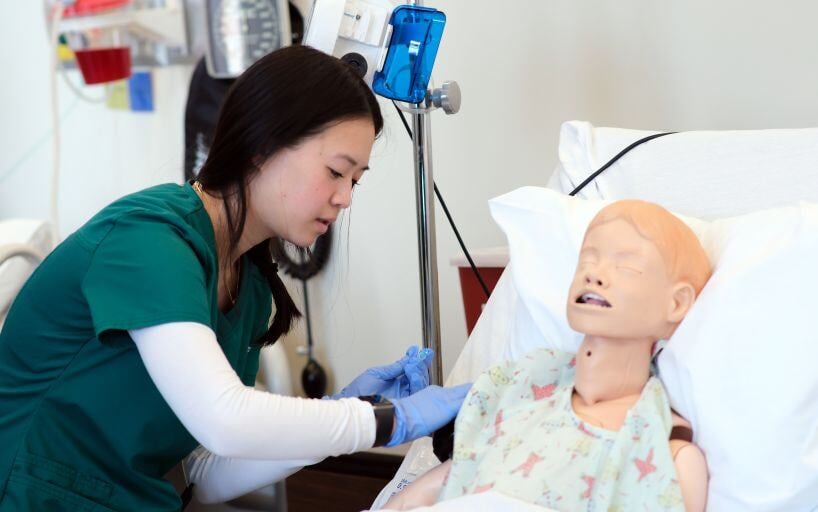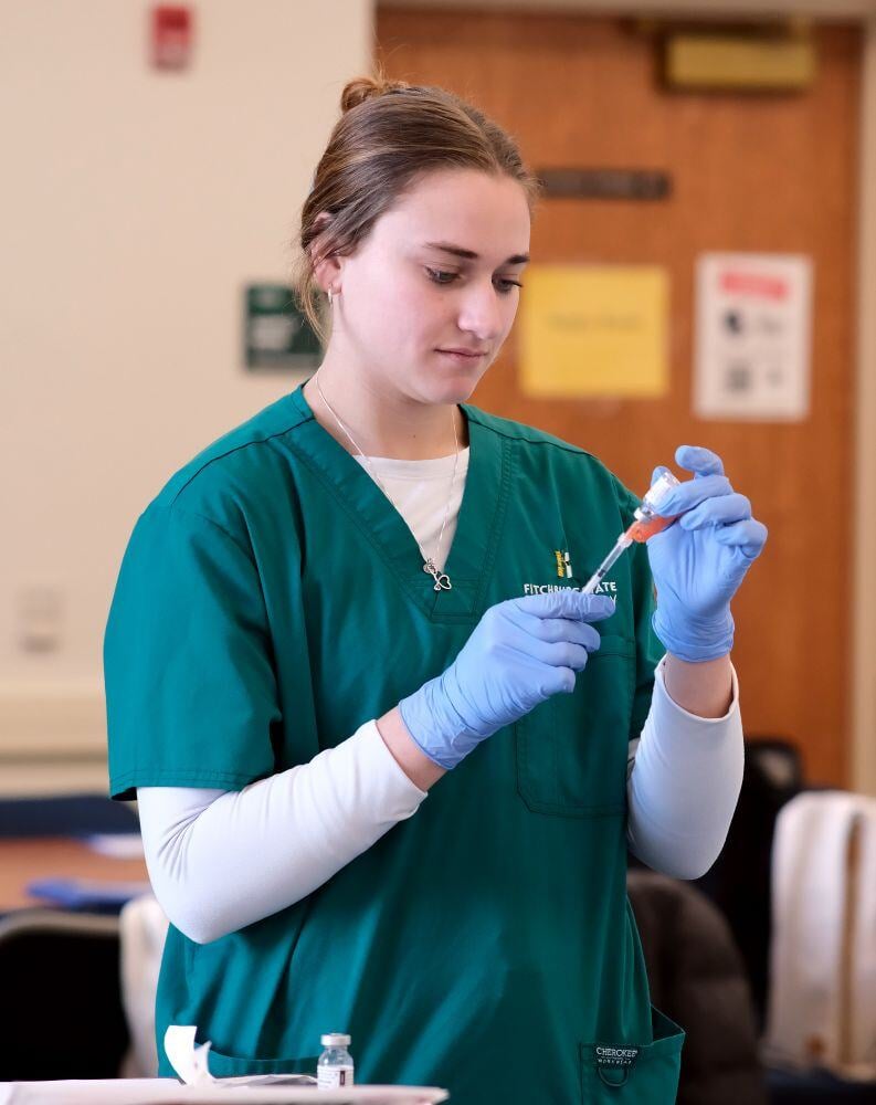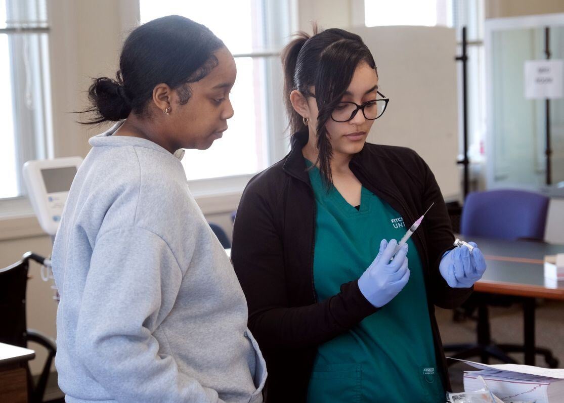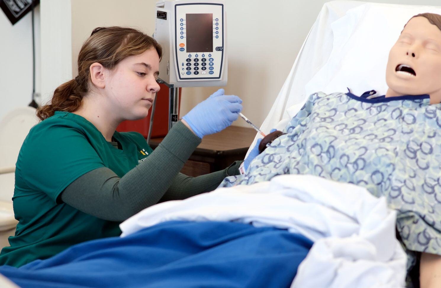Nursing students learn the methods of, and importance of checking with, and informing, a patient before injecting ordered medications in their Nursing Foundations Lab. In this course, emphasis is placed on professionalism, caring, communication, cultural considerations, spirituality, sexuality and health promoting activities.