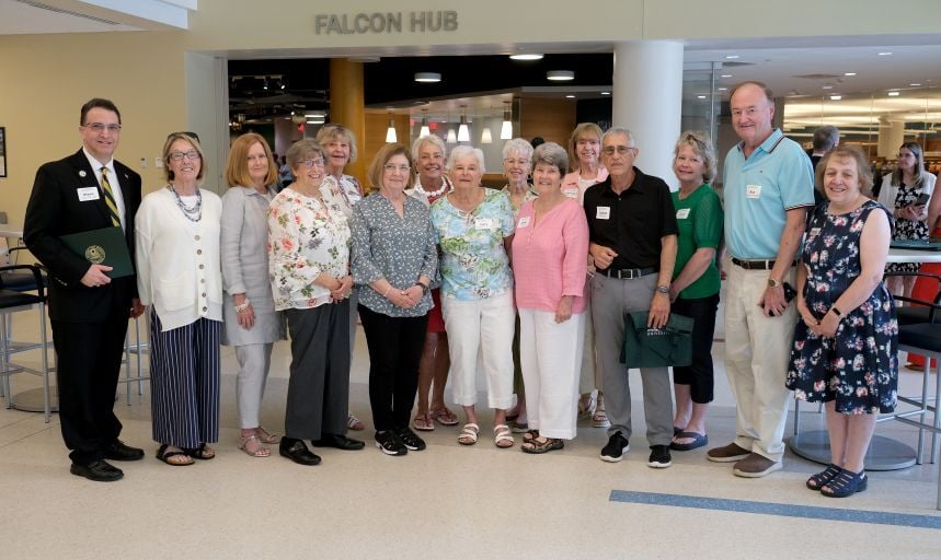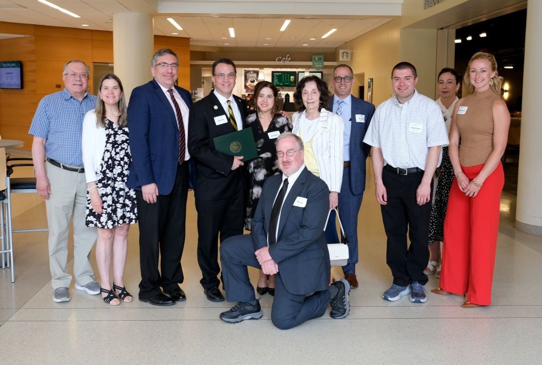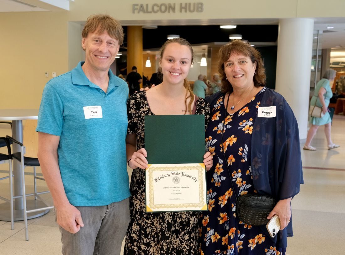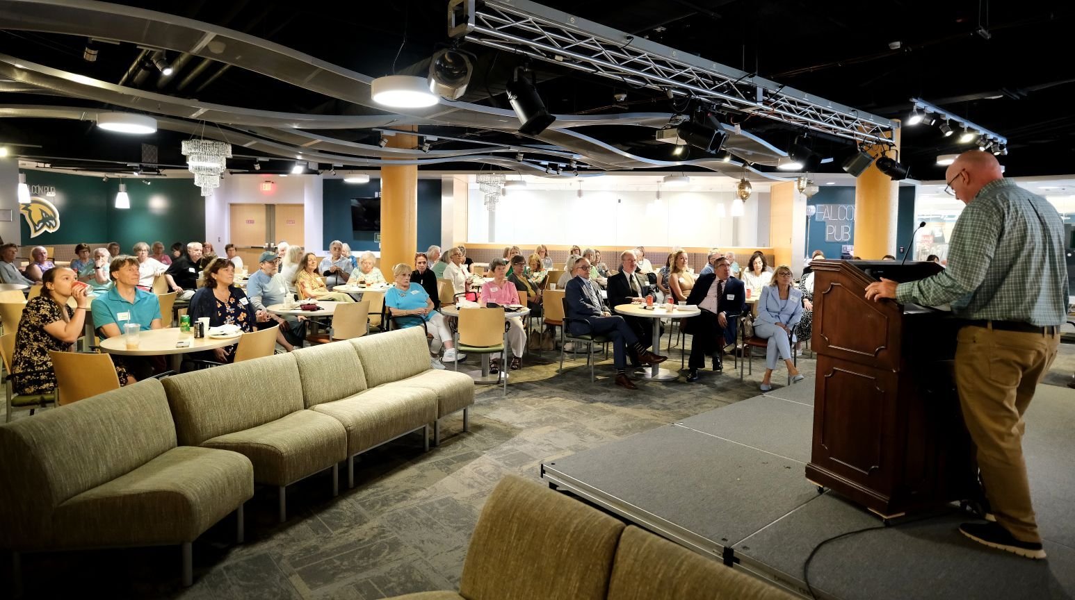 Yesterday, Alumni and Giving hosted their annual Retired Educators Luncheon in the Hammond Hall Falcon Hub. After a welcome from John Garten, ‘89, President of the Alumni Association, guests received a campus update from Vice President of Institutional Advancement, Jeffrey Wolfman. After that, Mr. Garten presented the Retired Educators scholarship to Aimee Dennler '26, and the Joel D. Miller Award to Steve Tulli '91, '95. The Joel D. Miller Award, established in 1955, is presented to a Fitchburg State University alumnus who is recognized as an outstanding educator. Joel D. Miller served as a state senator and member of the Board of Education, and is considered one of the three founders of the State Normal School in Fitchburg. In 1903, he was honored with the name of one of the university’s first dormitories, Miller Hall. In his honor.