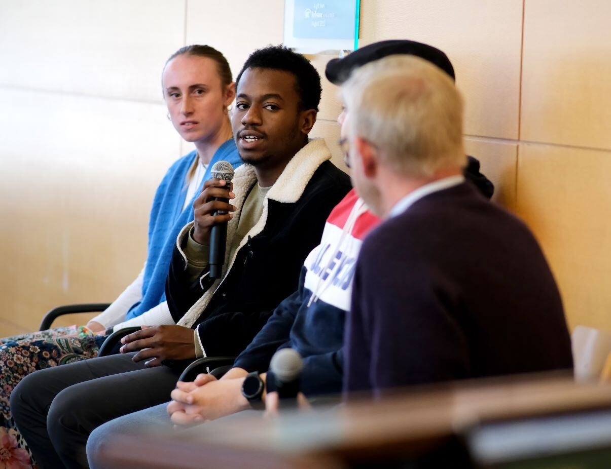 After introductions from Associate Vice President for Academic Affairs Franca Barricelli and Director of International Education Nelly Wadsworth at today's Board of Trustees meeting, three of our students who took part in our International Education programs shared their experiences with the Board members. Sky Goba (Communications faculty-led program in Greece), Kervins Blanc (Peace Studies faculty-led program in Ireland), and Gabriel Rivera (semester abroad at the University of Valencia, Spain) were interviewed by Matthew Bruun, Executive Director of Communications and Public Affairs.