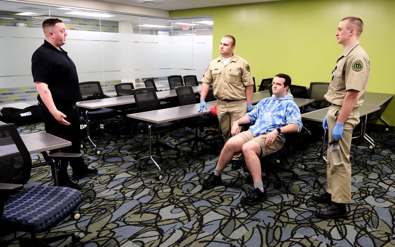 the 8th Fitchburg State University Police Program's Recruit Officer Course (ROC) was joined by Massachusetts District Attorney Association, Director of Training Jessica Stone, ADA David Yasinovsky along with interns Justin Xu, and Keiran Clark for mock trial sessions This exercise gives the students a feel for how they will be examined in a court proceeding.