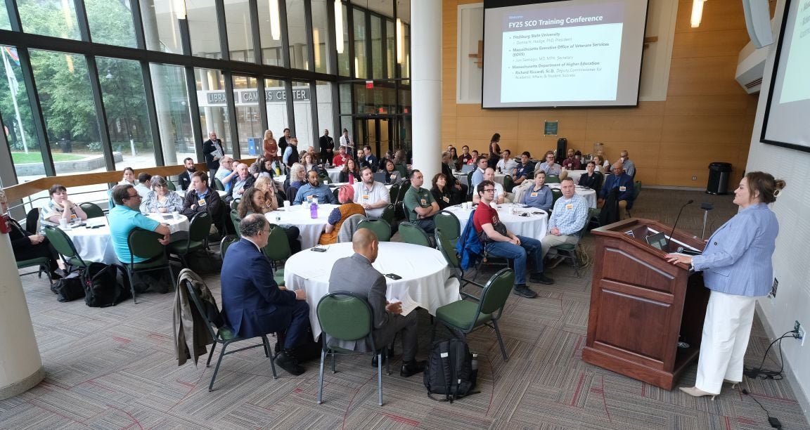 Fitchburg State University President Donna Hodge, Secretary of Executive Office of Veterans Services Jon Santiago, and Massachusetts Department of Higher Education Deputy Commissioner for Academic Affairs & Student Success Richard Riccardi welcomed representatives from colleges and universities across Massachusetts, New Hampshire, and Rhode Island, today for the the Veterans Certifying Official Conference sponsored by the state Department of Higher Education. Certifying officials on campuses help student veterans get the GI Bill benefits to which they are entitled. Assistant Commissioner for Academic & Veterans Affairs George O'Connor greeted the conference attendees who will take part in sessions on topics related to supporting student veterans on campus and helping them complete their academic goals. You can read about Fitchburg State's Veteran Services here.