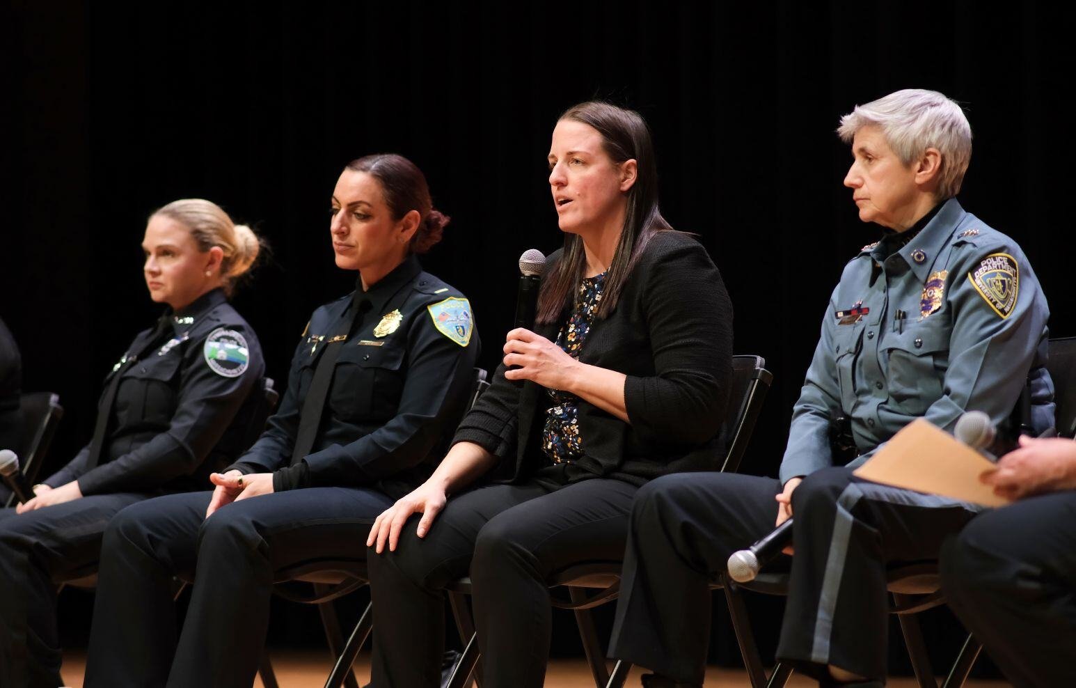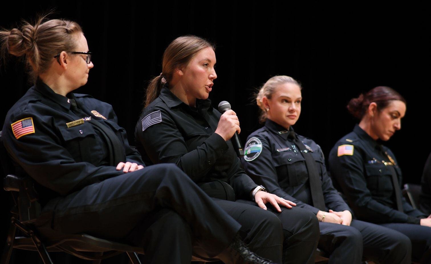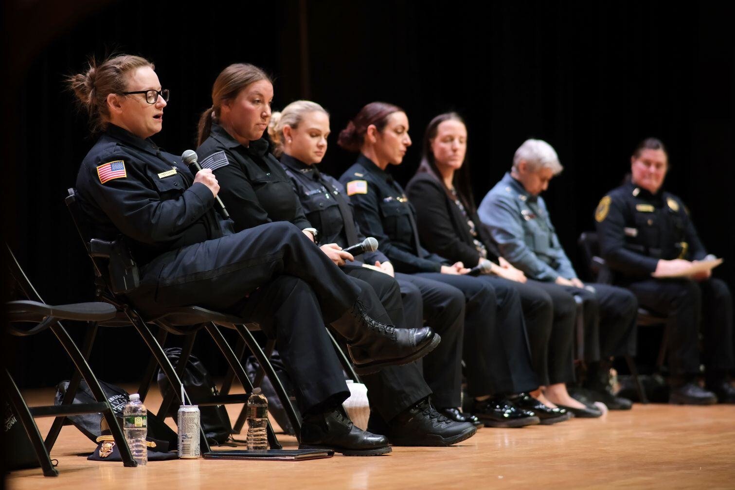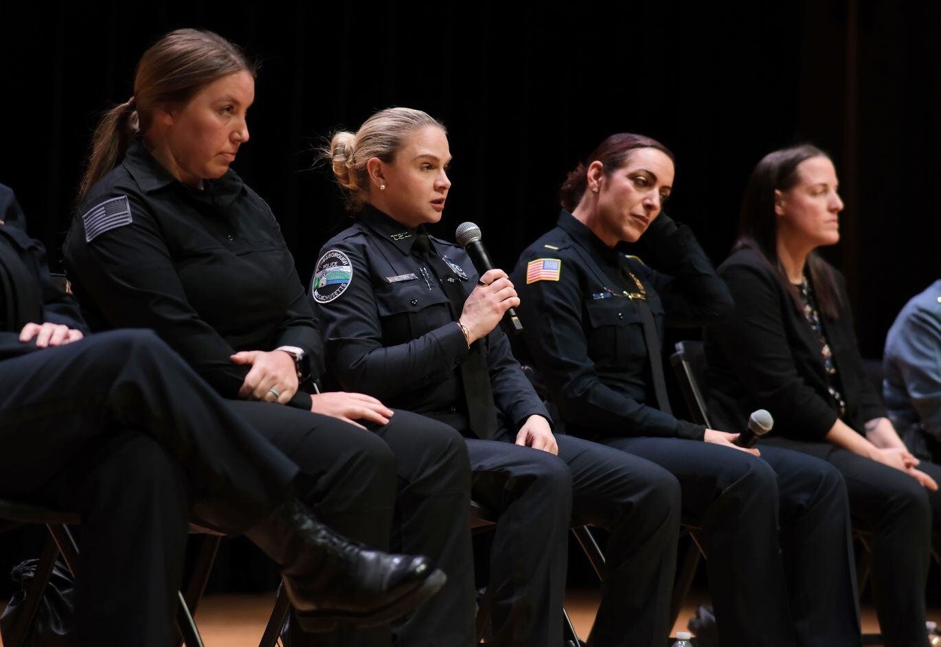 This Afternoon, Our Women's History Month celebration continued with a Women in Law Enforcement panel discussion at Fitchburg State University Police Program's Recruit Officer Course (ROC) monthly meeting in Weston Auditorium. Fitchburg State University Police Program Police Academy Director Alexandra Wysocki welcomed Lt. Kaitlyn Mercurio – Waltham PD. Officer Krista-Jean Forand – Carver Police Department Lt. Eleni Barbieri – Springfield PD Sgt. Det. Amyleigh DeVito Boston PD Officer Olivia King has been a member of the Tyngsborough Police Department Deputy Chief Nancy O’Loughlin – University of Massachusetts at Worcester). At the event, attendees got to hear about their career paths and unique experiences in a profession that is only 13% female.