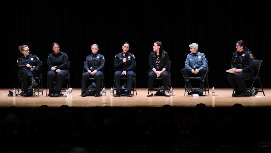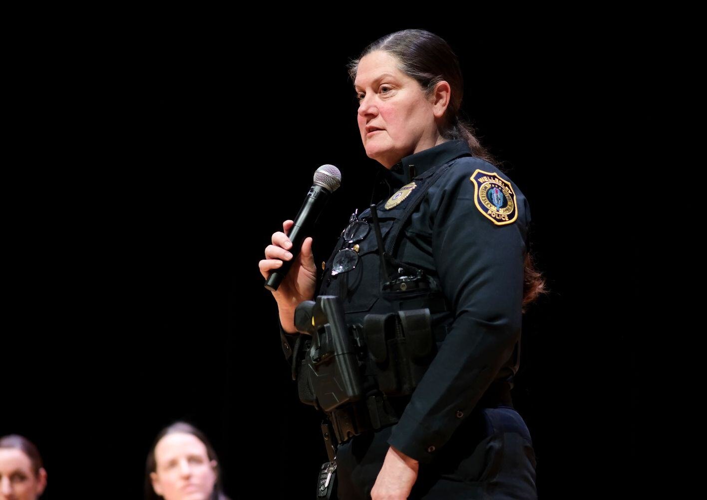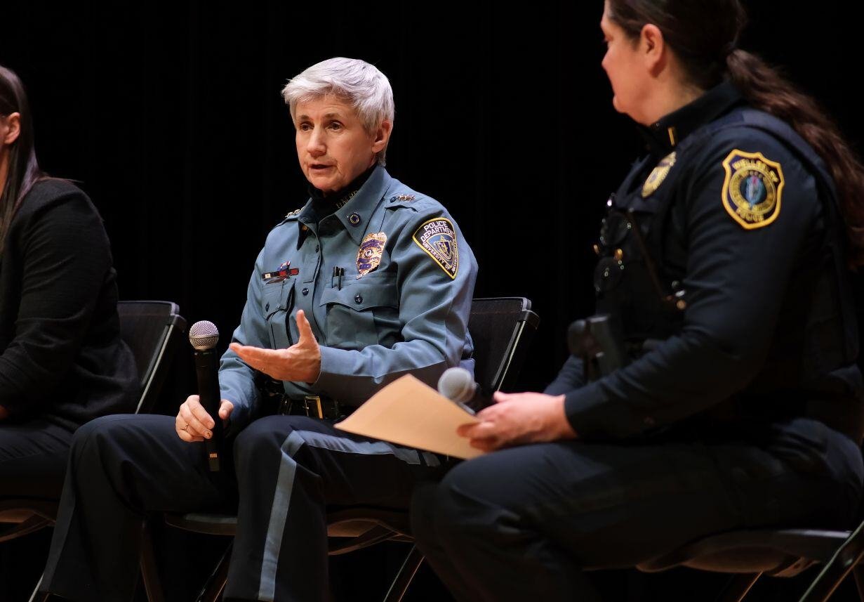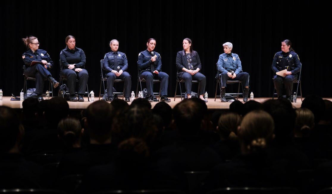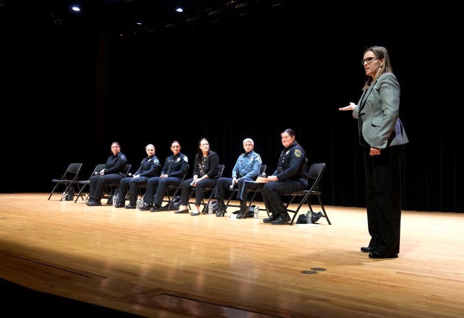 This Afternoon, Our Women's History Month celebration continued with a Women in Law Enforcement panel discussion at Fitchburg State University Police Program's Recruit Officer Course (ROC) monthly meeting in Weston Auditorium. Fitchburg State University Police Program Police Academy Director Alexandra Wysocki welcomed Lt. Kaitlyn Mercurio – Waltham PD. Officer Krista-Jean Forand – Carver Police Department Lt. Eleni Barbieri – Springfield PD Sgt. Det. Amyleigh DeVito Boston PD Officer Olivia King has been a member of the Tyngsborough Police Department Deputy Chief Nancy O’Loughlin – University of Massachusetts at Worcester). At the event, attendees got to hear about their career paths and unique experiences in a profession that is only 13% female.